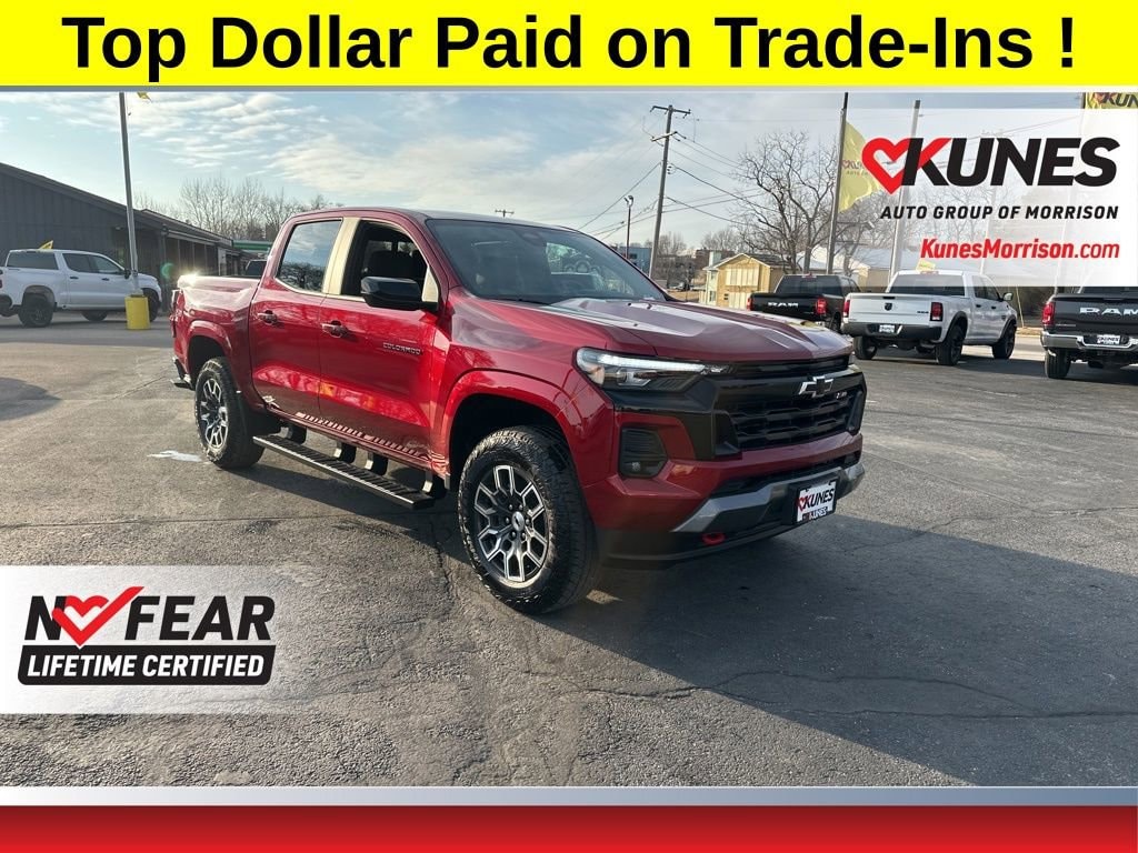 Radiant Red Tintcoat 2026 Chevrolet Colorado Z71 Colorado Z71, 4D Crew Cab, 2.7L I4 Turbocharged DOHC 16V LEV3-ULEV50 310hp, 8-Speed Automatic, 4WD, Radiant Red Tintcoat, Jet Black / Adrenaline Red Leather, Navigation System, Z71 Convenience Package III, 3.42 Rear Axle Ratio, 4-Way Manual Passenger Seat Adjuster, 4-Wheel Disc Brakes, 6 Speakers, 6-Speaker Audio System Feature, 8-Way Power Driver Seat Adjuster, ABS brakes, Air Conditioning, All-Weather Floor Mats, Alloy wheels, AM/FM radio: SiriusXM with 360L, Apple CarPlay/Android Auto, Auto High-beam Headlights, Auto-dimming Rear-View mirror, Automatic Emergency Braking, Automatic temperature control, Black Assist Steps, Brake assist, Bumpers: body-color, Chevy Safety Assist, Cloth/Evotex Seat Trim, Compass, Delay-off headlights, Driver and Front Passenger Heated Seats, Driver and Front Passenger Ventilated Seats, Driver door bin, Driver Memory Settings, Driver Seatback Map Pocket, Driver vanity mirror, Dual front impact airbags, Dual front side impact airbags, Electronic Stability Control, Emergency communication system: OnStar, Following Distance Indicator, Forward Collision Alert, Front anti-roll bar, Front Bucket Seats, Front Center Armrest, Front dual zone A/C, Front fog lights, Front Passenger Seatback Map Pocket, Front Pedestrian and Bicyclist Braking, Front reading lights, Front wheel independent suspension, Heated door mirrors, Heated front seats, Heated Steering Wheel, Illuminated entry, IntelliBeam Automatic High Beam on/Off, Lane Keep Assist with Lane Departure Warning, Low tire pressure warning, Occupant sensing airbag, Outside temperature display, Overhead airbag, Overhead console, Panic alarm, Passenger door bin, Passenger vanity mirror, Perforated Leather-Appointed Seat Trim, Power door mirrors, Power Driver Lumbar Control Seat Adjuster, Power driver seat, Power steering, Power windows, Radio data system, Radio: 11.3 Diagonal Advanced Color LCD Display, Rear Center Armrest, Rear reading lights, Rear step bumper, Rear window defroster, Remote keyless entry, Security system, SiriusXM with 360L Trial Subscription, Speed control, Speed-sensing steering, Split folding rear seat, Steering Wheel Mounted Audio Controls, Steering wheel mounted audio controls, Tachometer, Telescoping steering wheel, Tilt steering wheel, Traction control, Trip computer, Variably intermittent wipers, Wheels: 18 x 8.5 Android Dark Full Gloss Aluminum, Wireless Phone Projection, Colorado Z71, 4D Crew Cab, 2.7L I4 Turbocharged DOHC 16V LEV3-ULEV50 310hp, 8-Speed Automatic, 4WD, Radiant Red Tintcoat, Jet Black / Adrenaline Red Leather, Navigation System, Z71 Convenience Package III.