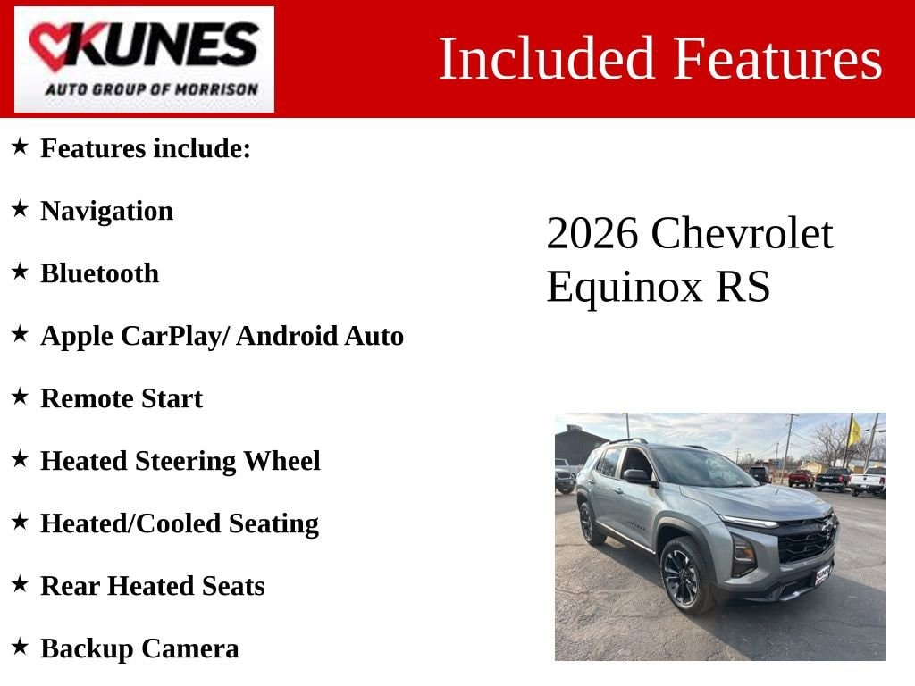 Sterling Gray Metallic 2026 Chevrolet Equinox RS Features include:, Navigation, Bluetooth, Apple CarPlay/ Android Auto, Remote Start, Heated Steering Wheel, Heated/Cooled Seating, Rear Heated Seats, Backup Camera, Equinox RS, 4D Sport Utility, 1.5L DOHC, 8-Speed Automatic, AWD, Sterling Gray Metallic, Black With Red Accents, Convenience Package III, Floor Liner Package, Navigation System, 2-Way Power Driver Lumbar Control Seat Adjuster, 3.47 Final Drive Axle Ratio, 4-Wheel Disc Brakes, 6 Speakers, ABS brakes, Air Conditioning, All-Weather Floor Liners, Alloy wheels, AM/FM radio: SiriusXM, Auto High-beam Headlights, Automatic temperature control, Brake assist, Bumpers: body-color, Cargo Mat, Compass, Delay-off headlights, Driver 8-Way Power Seat Adjuster, Driver door bin, Driver vanity mirror, Dual front impact airbags, Dual front side impact airbags, Electronic Stability Control, Emergency communication system: OnStar and Chevrolet connected services capable, Evotex Seat Trim, Four wheel independent suspension, Front anti-roll bar, Front Bucket Seats, Front Center Armrest, Front dual zone A/C, Front Passenger 2-Way Power Lumbar Seat Adjuster, Front Passenger 4-Way Manual Seat Adjuster, Front Passenger 8-Way Power Seat Adjuster, Front reading lights, Fully automatic headlights, Garage door transmitter, Heated door mirrors, Heated Driver and Front Passenger Seats, Heated front seats, Heated Rear Outboard Seating Positions, Heated steering wheel, Illuminated entry, Low tire pressure warning, Memory Settings, Mosaic Black Metallic Roof, Occupant sensing airbag, Outside temperature display, Overhead airbag, Overhead console, Panic alarm, Passenger door bin, Passenger vanity mirror, Power door mirrors, Power driver seat, Power Liftgate, Power steering, Power windows, Premium audio system: Chevrolet Infotainment 3, Radio data system, Radio: 11.3 Diagonal Advanced Color LCD Display, Rain sensing wipers, Rear anti-roll bar, Rear reading lights, Rear seat center armrest, Rear window defroster, Rear window wiper, Remote keyless entry, Second Row All-Weather Mat, Security system, SiriusXM with 360L Trial Subscription, Speed control, Speed-sensing steering, Split folding rear seat, Spoiler, Sport steering wheel, Steering wheel mounted audio controls, Tachometer, Telescoping steering wheel, Tilt steering wheel, Traction control, Trip computer, Variably intermittent wipers, Ventilated Driver Seat, Ventilated Front Passenger Seat, Wheels: 19 Carbon Flash Metallic Aluminum, Equinox RS, 4D Sport Utility, 1.5L DOHC, 8-Speed Automatic, AWD, Sterling Gray Metallic, Black With Red Accents, Convenience Package III, Floor Liner Package, Navigation System.